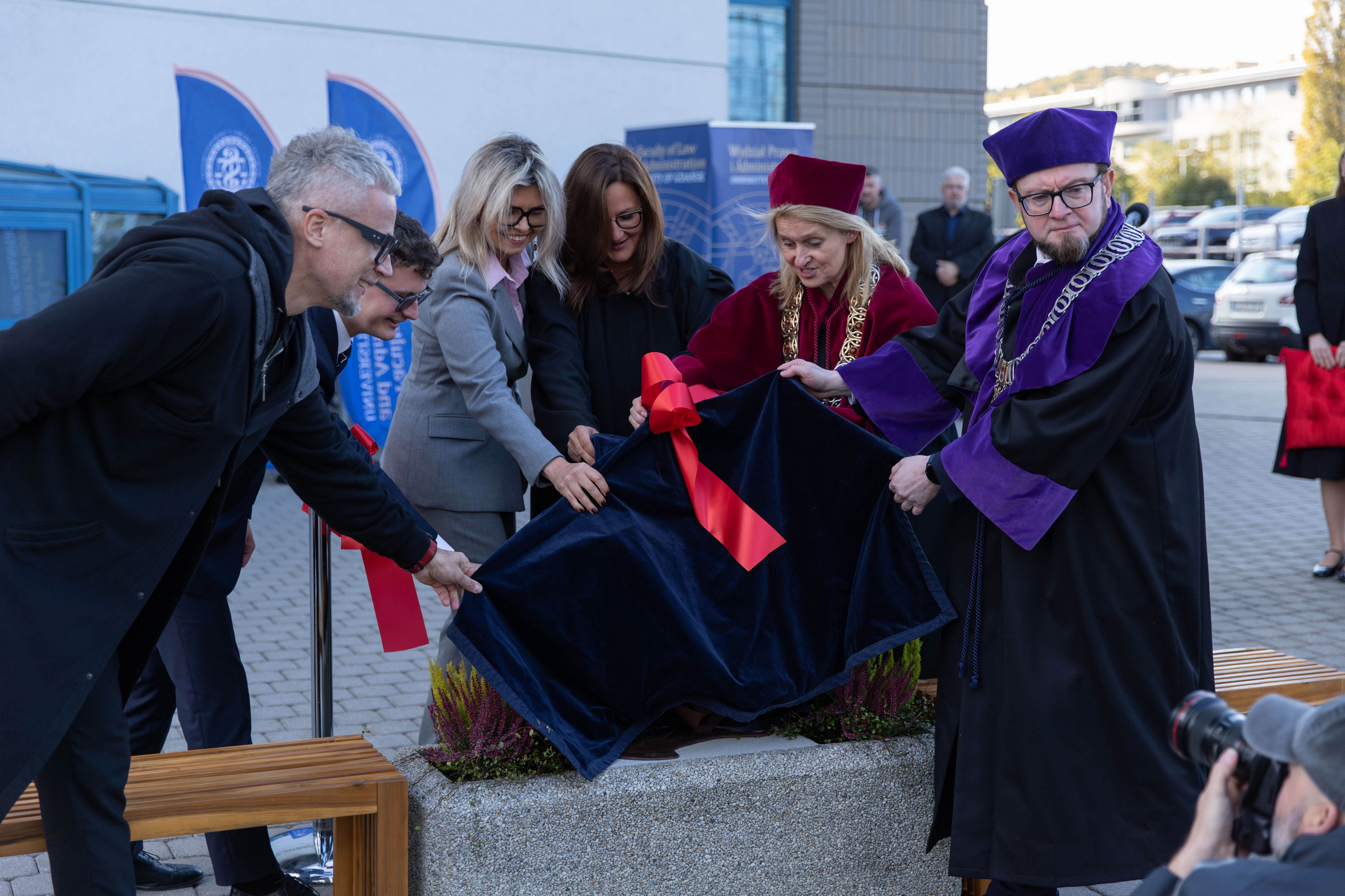 The unveiling of Hewelion was attended by, among others: Vice-Rector for Student Affairs dr hab. Urszula Patocka-Sigłowy, prof. UG, Chancellor of the University of Gdańsk dr hab. inż. Aneta Oniszczuk-Jastrząbek, prof. UG, Dean of the Faculty of Law and Administration dr hab. Wojciech Zalewski, prof. UG, Vice-Dean for Education at the Faculty of Law and Administration dr hab. Małgorzata Balwicka-Szczyrba, prof. UG, Head of the Dean's Office at the Faculty of Law and Administration Katarzyna Rynkowska, and a representative of the Student Council Wiktor Jakiel.