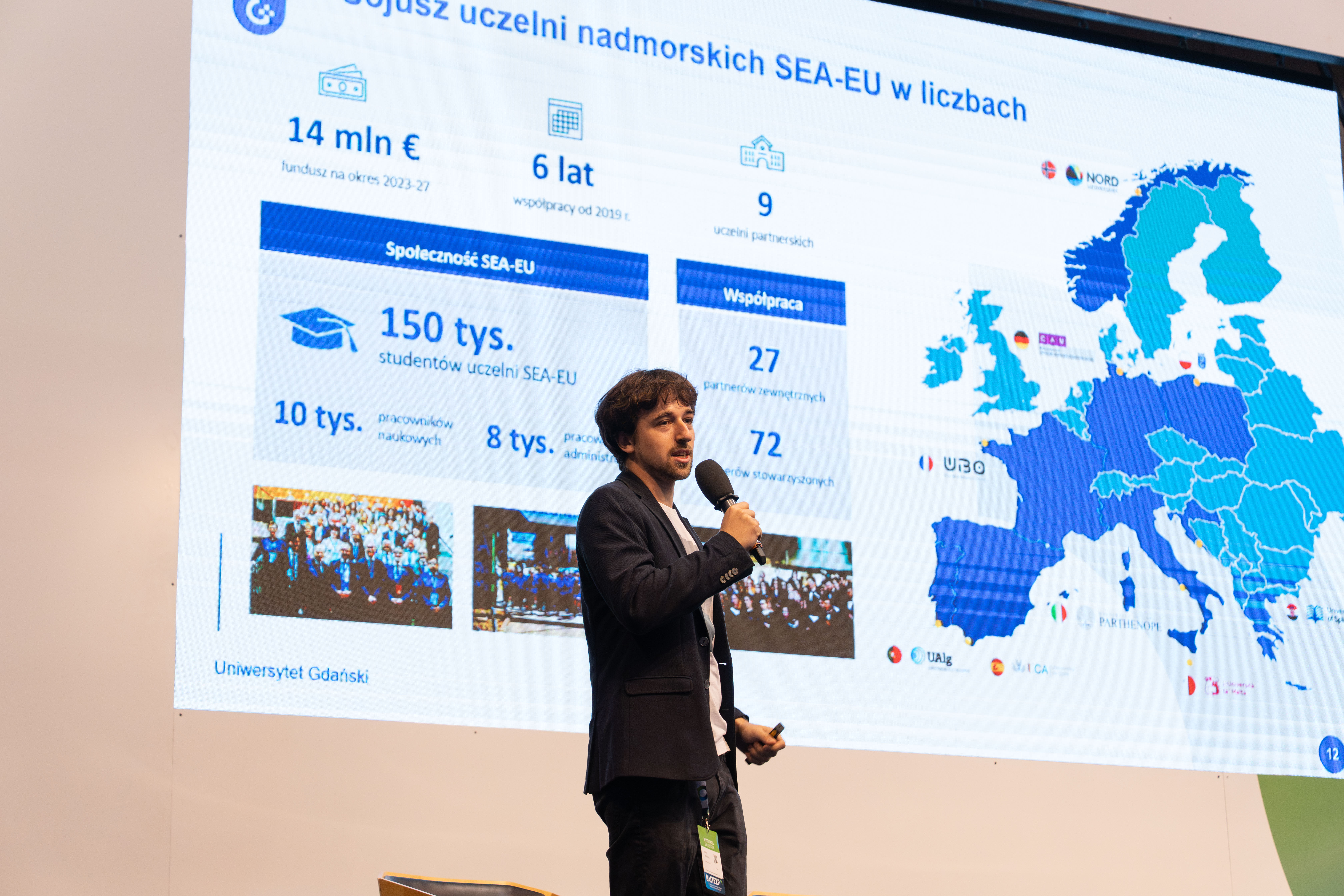 Marcel Jakubowski z Biura Projektu European University of the Seas przedstawił działania sojuszu 9 europejskich uczelni nadmorskich SEA-EU, do którego należy Uniwersytet Gdański. Zaprezentował liczne korzyści, z których mogą korzystać studenci naszej uczelni w ramach międzynarodowego konsorcjum - m.in. staże badawcze, kursy językowe, czy wyjazdy zagraniczne. Ponadto opowiedział o flagowej inicjatywie sojuszu, jaką są wspólne kierunki studiów utworzone i prowadzone przez uczelnie SEA-EU: MIPMAL, Sea-BluE i STORM.