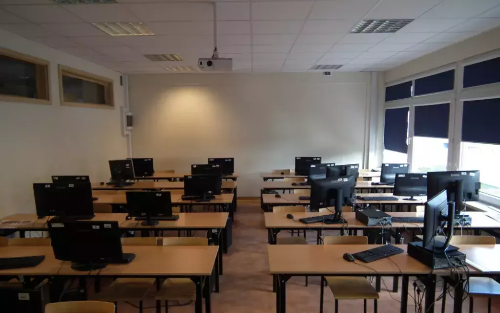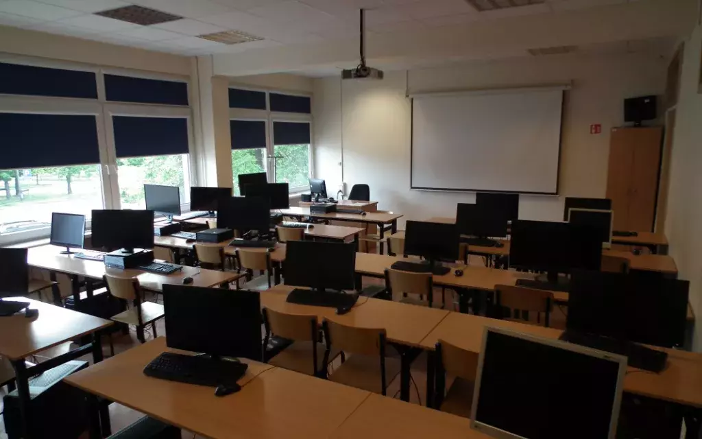 Dwie w pełni wyposażone pracownie komputerowe. W każdej znajdują się 24 stanowiska komputerowe oraz stanowisko dla prowadzącego. Pracownie wyposażone w rzutniki multimedialne i sterowane elektronicznie ekrany. Rolety w oknach umożliwiają osiągnięcie pełnego zaciemnienia.