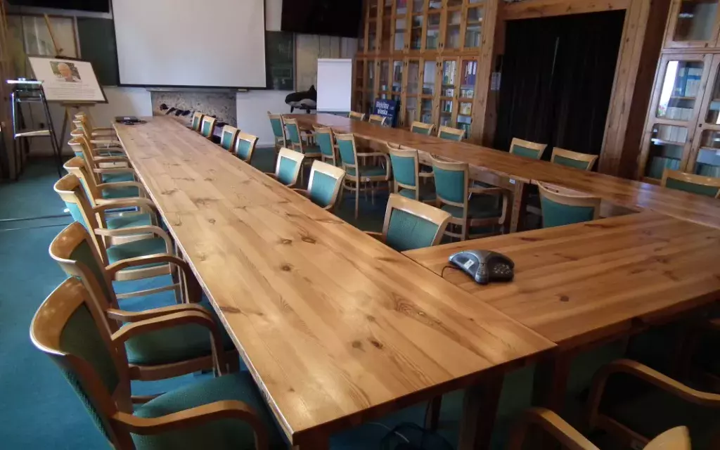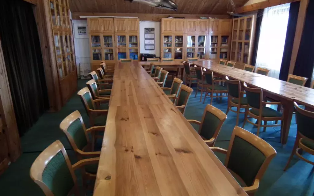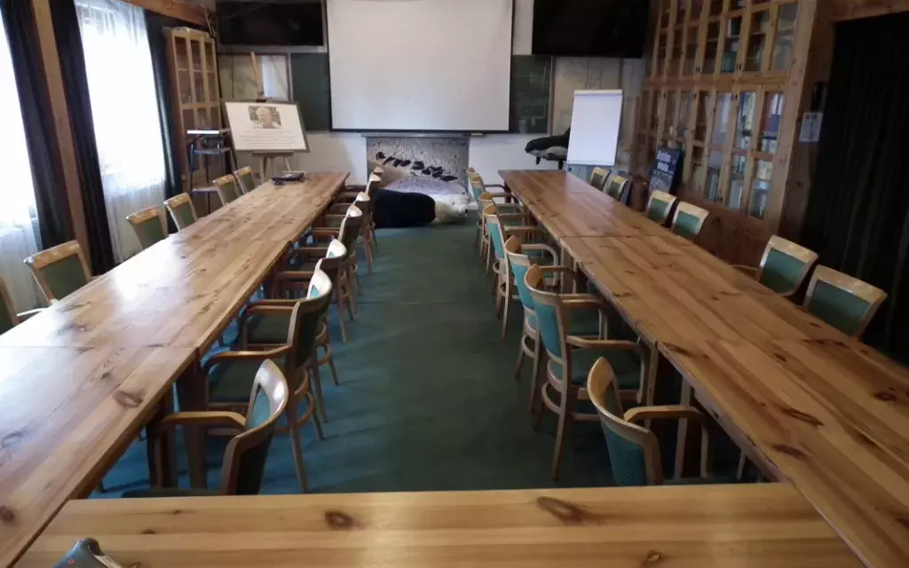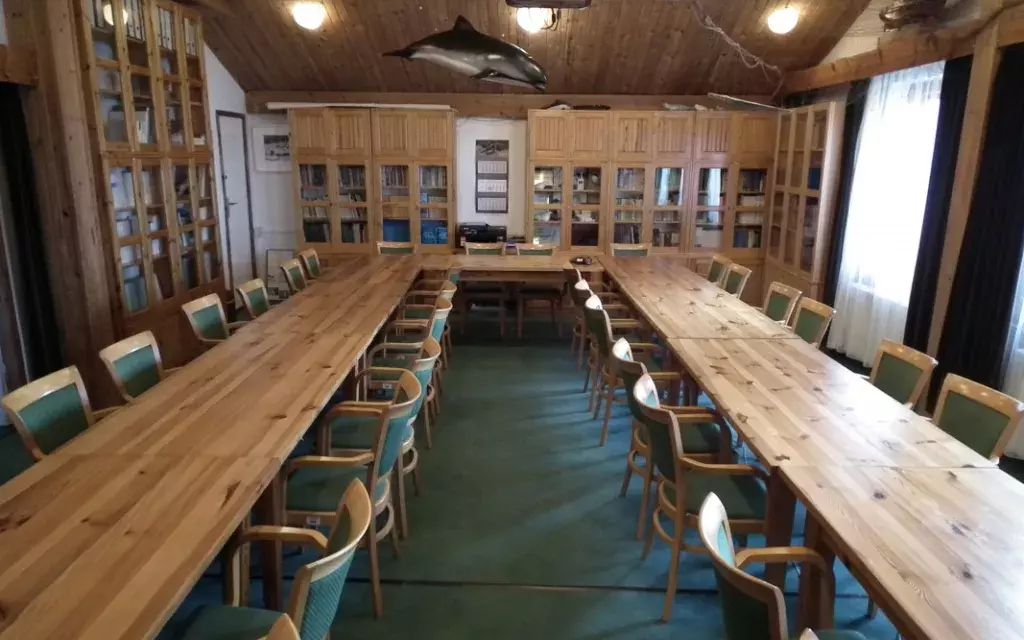 Sala dydaktyczna w budynku głównym Stacji Morskiej im. Prof. Krzysztofa Skóry to bardzo klimatyczne pomieszczenie, wyposażone w sprzęt niezbędny do przeprowadzenia prezentacji lub szkolenia. Do Państwa dyspozycji jest laptop oraz rzutnik multimedialny. Układ stołów w kształt litery U zapewnia 34 wygodne miejsca dla uczestników spotkania.