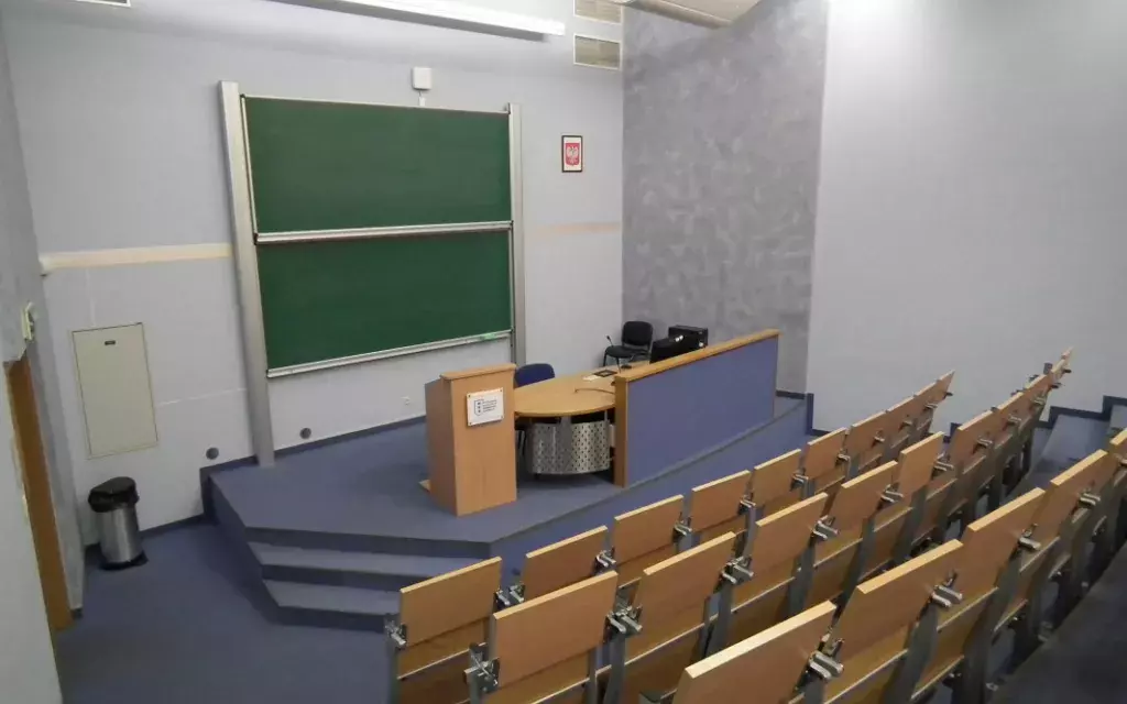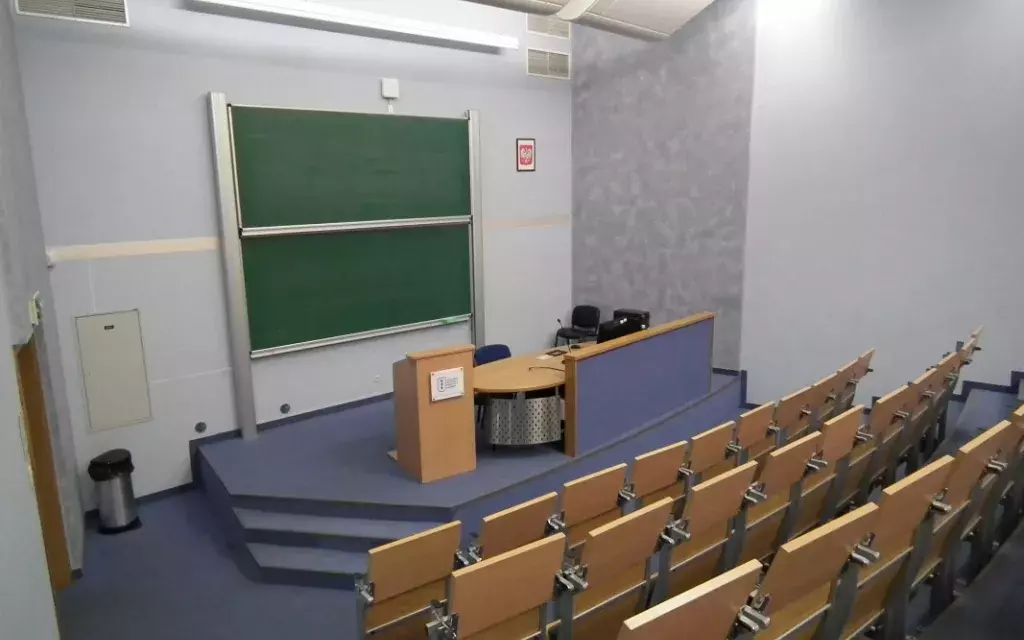 Pomieszczenie o układzie kaskadowym z wejściami z poziomu parteru oraz 1 piętra, mogące pomieścić do 170 osób. Częścią audytorium jest podest z ustawionym na nim niemobilnym stołem prezydialnym oraz mównicą. Wyposażenie multimedialne to komputer, rzutnik multimedialny i duży ekran projekcyjny. Pomieszczenie jest klimatyzowane.