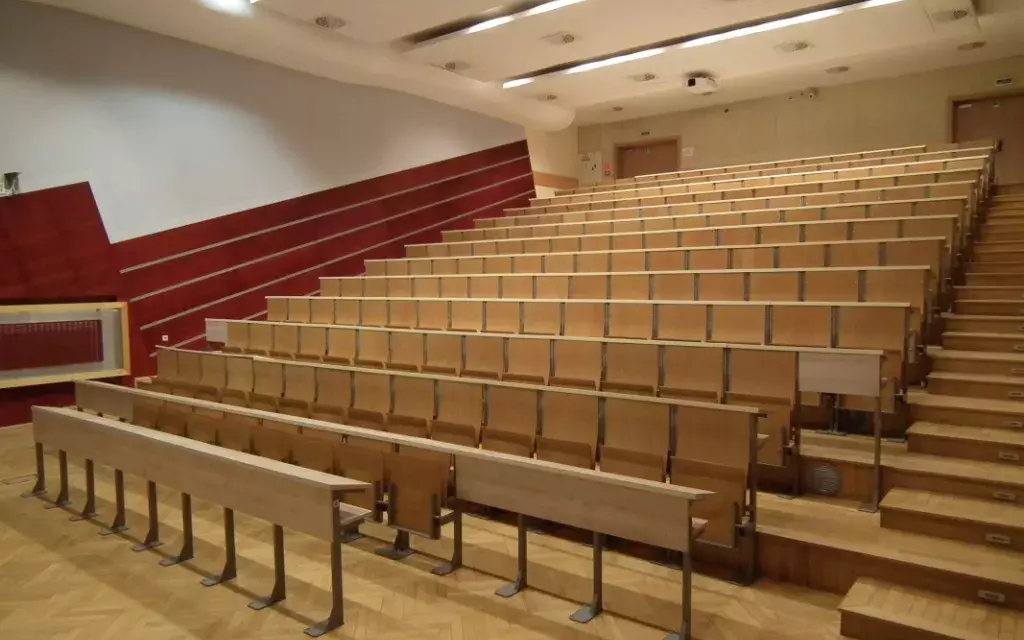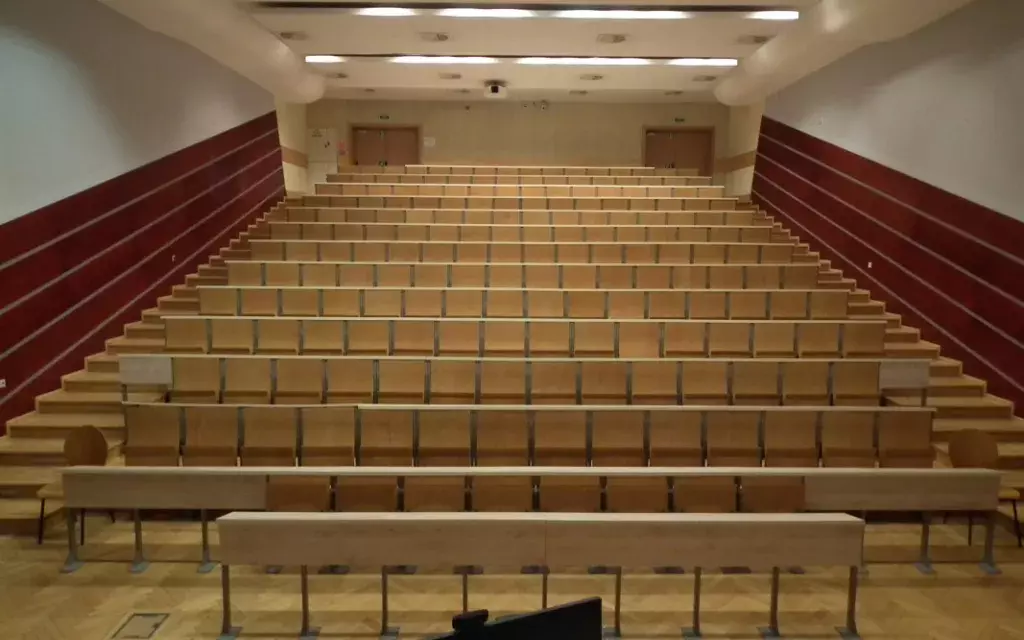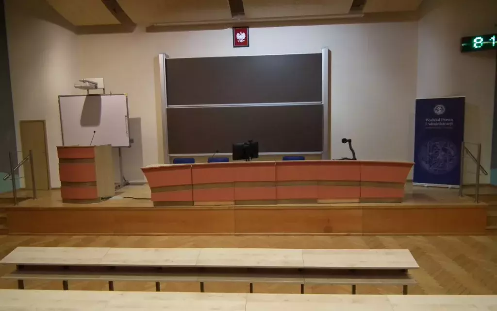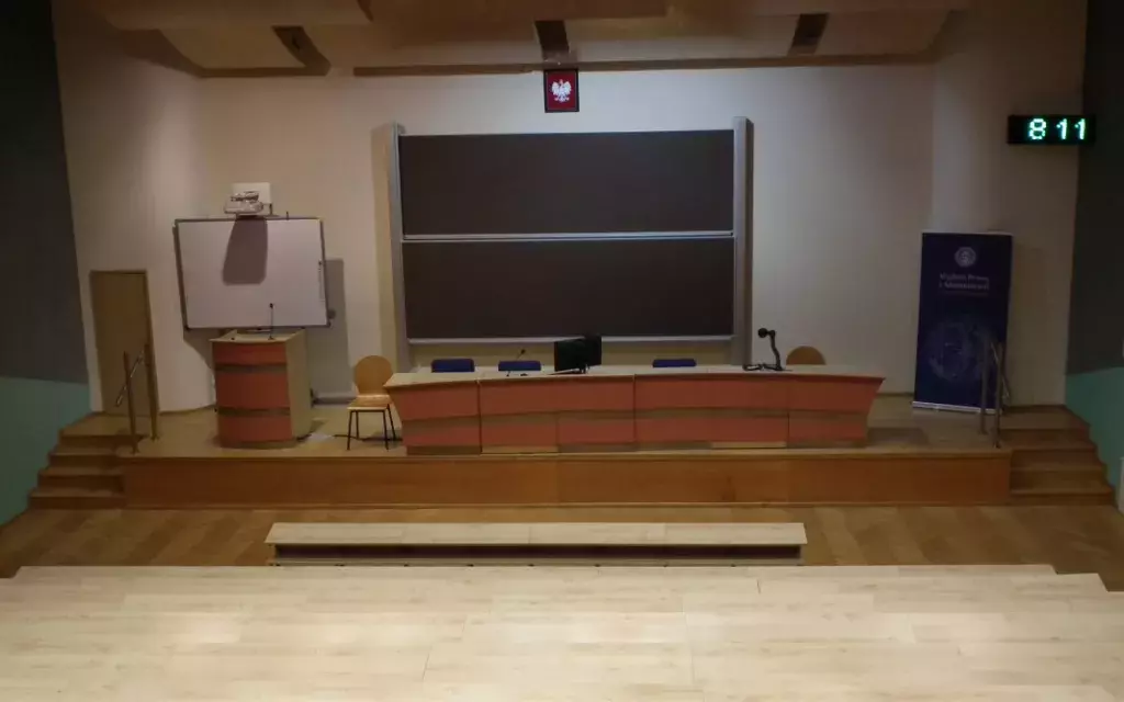 Pomieszczenie dwukondygnacyjne (wejście z parteru oraz z poziomu pierwszego piętra) z 200 miejscami siedzącymi w układzie kaskadowym. W audytorium znajduje się wyposażenie multimedialne: komputer, rzutnik multimedialny, system nagłośnienia. Częścią sali jest podest i ustawiony na nim niemobilny stół prezydialny oraz mównica.