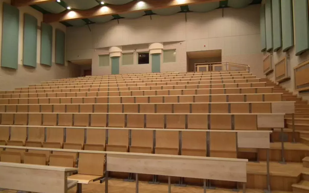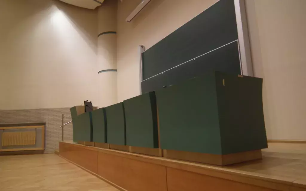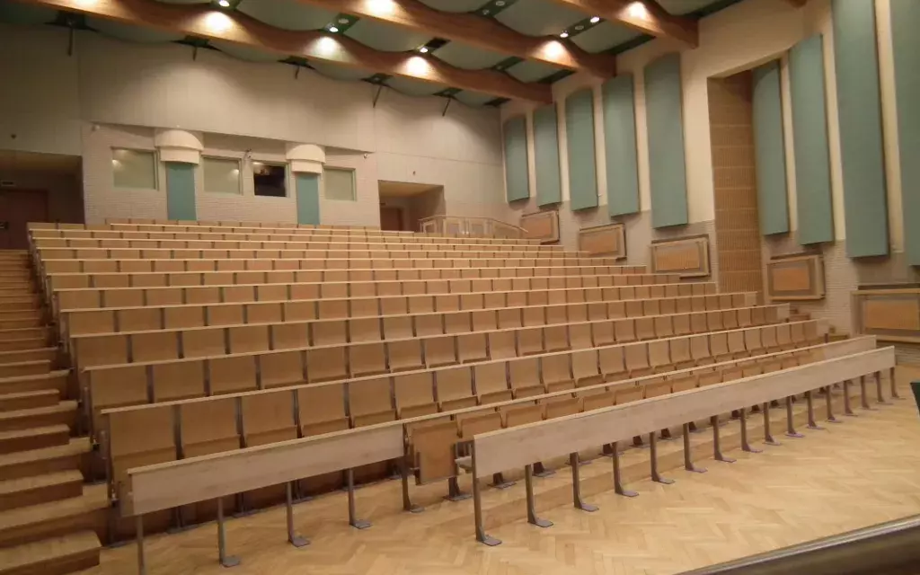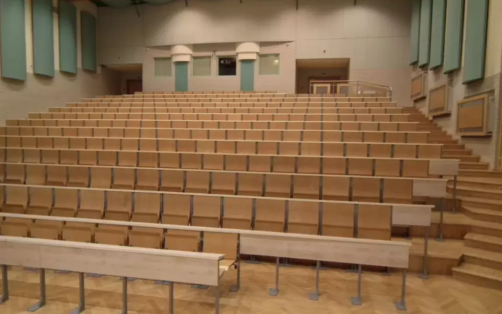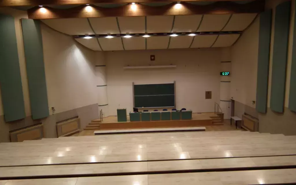 Pomieszczenie dwukondygnacyjne (wejście z parteru oraz z poziomu pierwszego piętra) z 300 miejscami siedzącymi umieszczonymi kaskadowo. W audytorium znajduje się wyposażenie multimedialne: komputer, rzutnik multimedialny oraz system nagłośnienia. Częścią pomieszczenia jest podest i ustawiony na nim niemobilny stół prezydialny, oraz mównica.